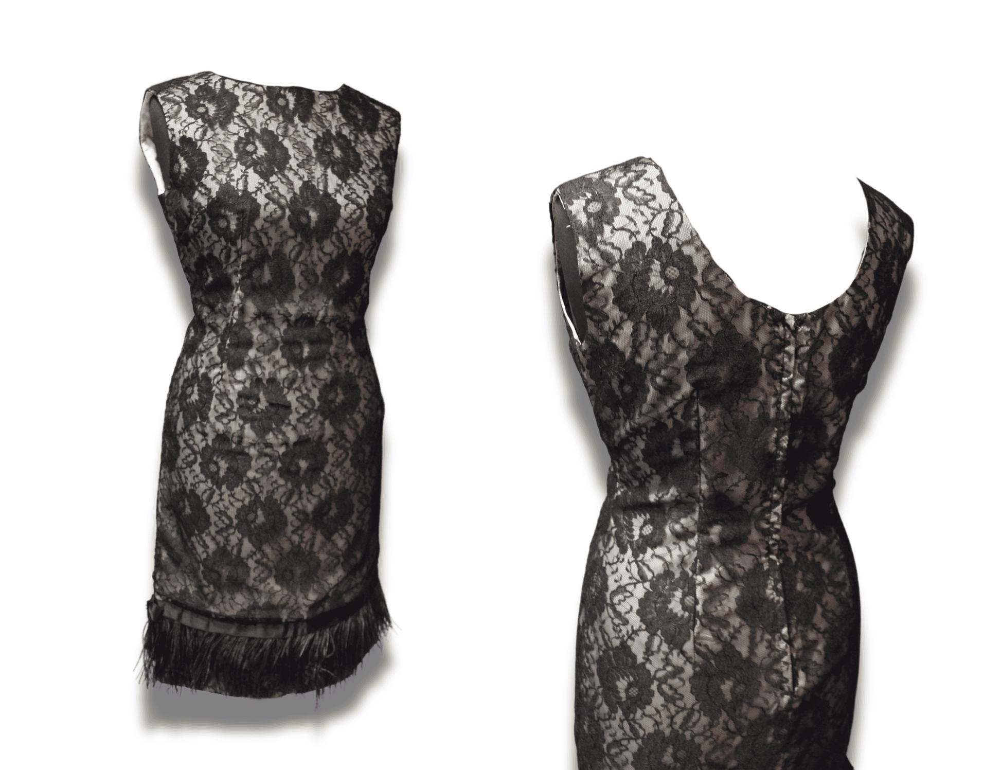Step into effortless glamour with this stunning 1960s vintage Carnegie dress, fits size 14. Its chic black lace shift design is topped off with a playful feather trim, bringing a cheeky dash of whimsy to your cocktail wardrobe. Whether you're mingling or making an entrance, this beauty is your ticket to turning heads and stealing the spotlight. Pure nostalgic magic, darling!
