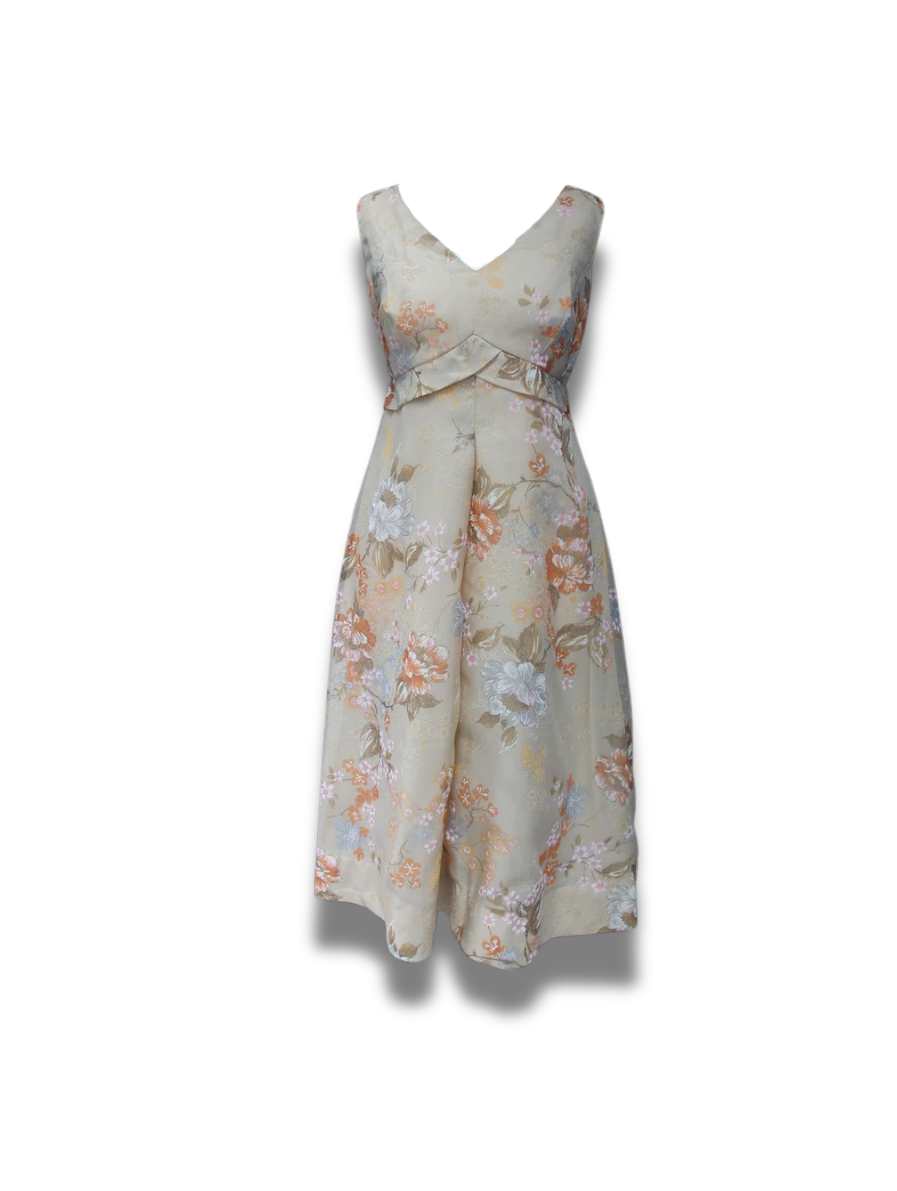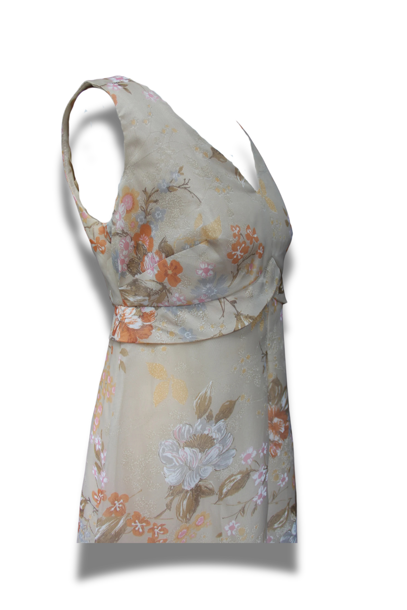 The print on this dress is just so pretty. Nude dress with absolutely stunning floral pattern all over. Soft V neck, thick straps and a high waistline. Beautiful foldover fabric detail and then a soft fit & flare skirt. Fastens with a centreback zip. Some of the stitching in the darts is very delicate but in really great condition! Label is Irving Nadler.