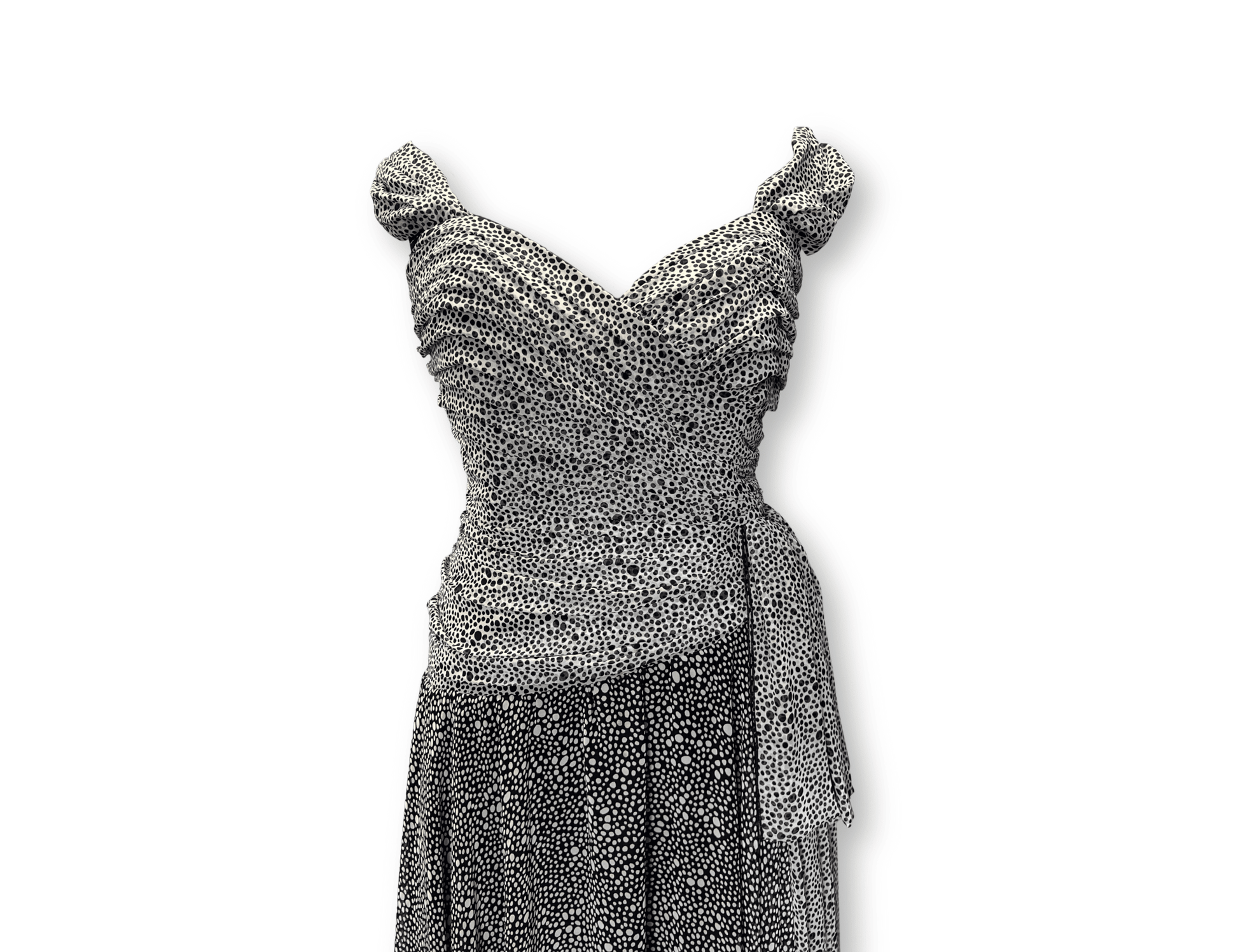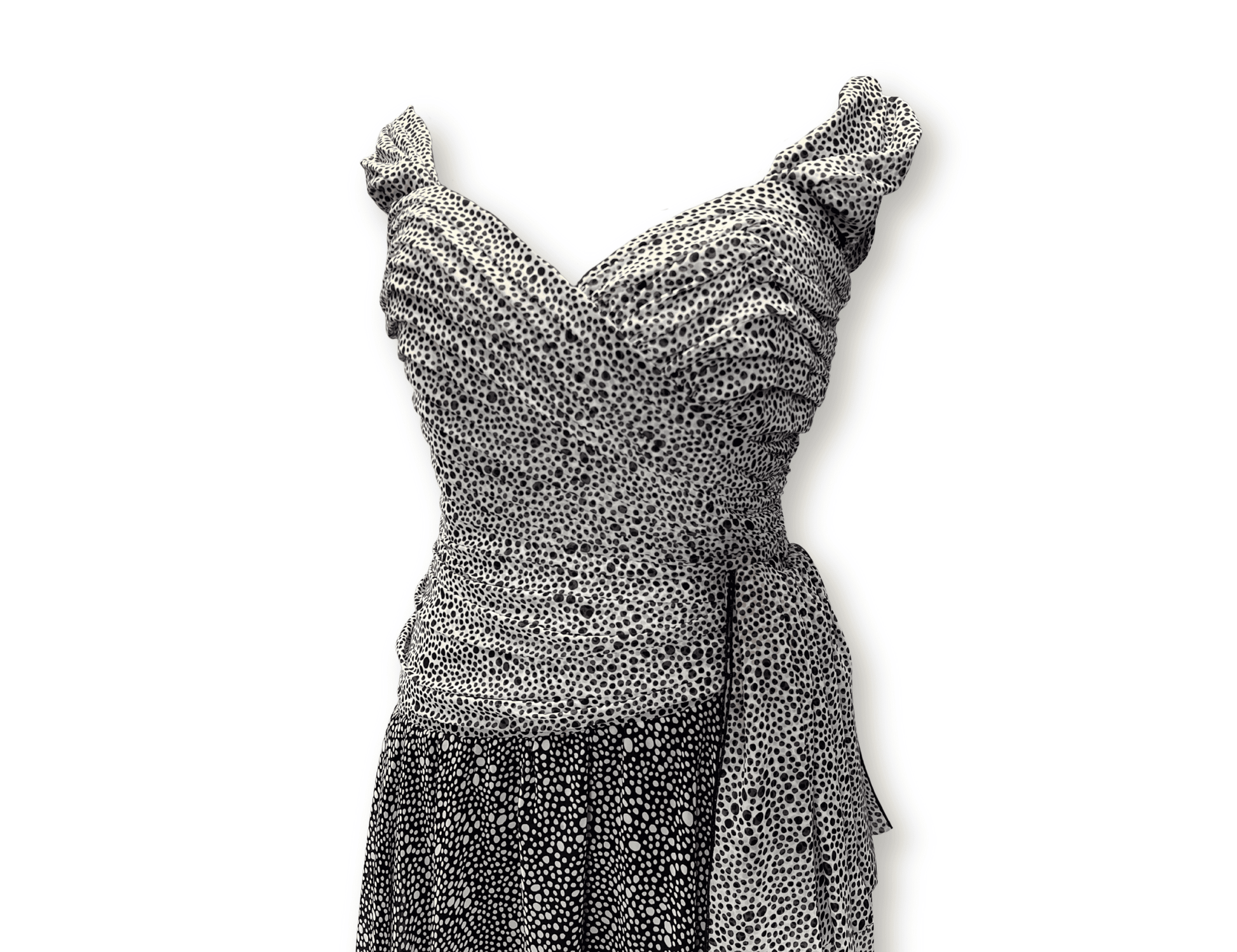 A vintage 1980s Paragi dress with a quietly dramatic presence. The fitted bodice is built from carefully layered fabric, drawing the eye inward before flowing beautifully into softer movement below. Black and white polka dots scatter across the surface, giving the piece depth without overpowering its shape.