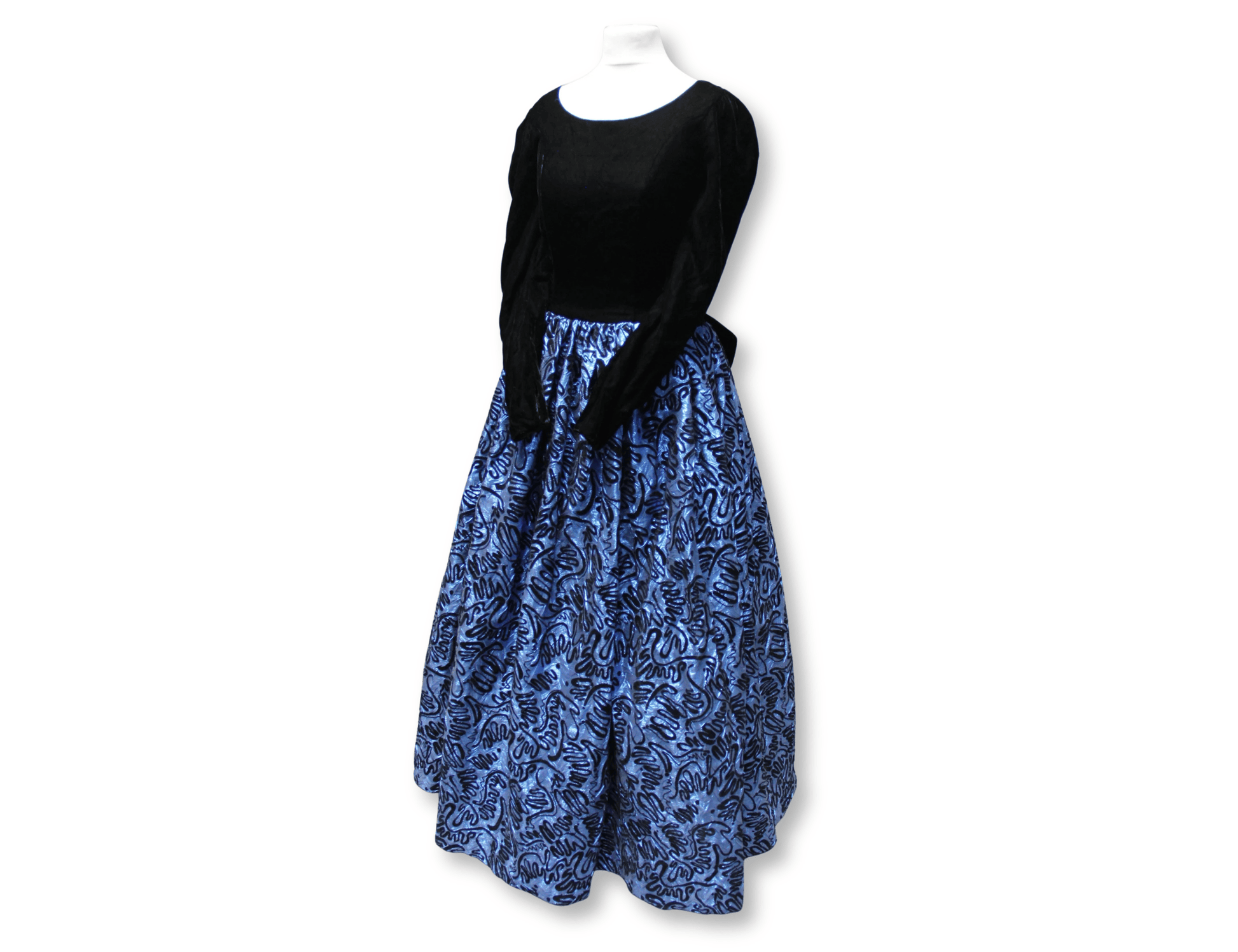 The full skirt is where things get properly special: metallic blue fabric with an included underskirt for volume, flocked all over with black velvet in an abstract, almost calligraphic pattern. It catches the light beautifully and moves like a dream.