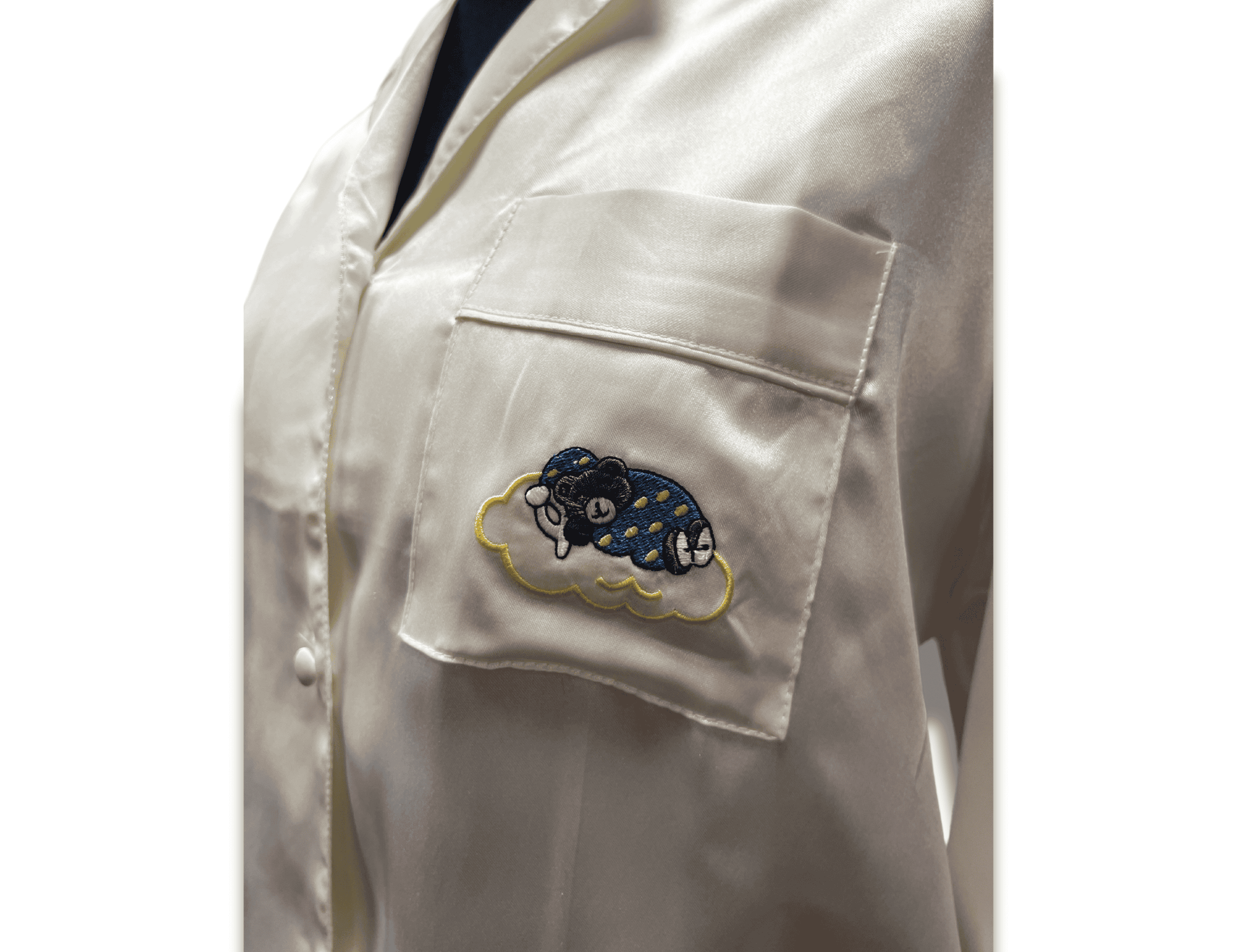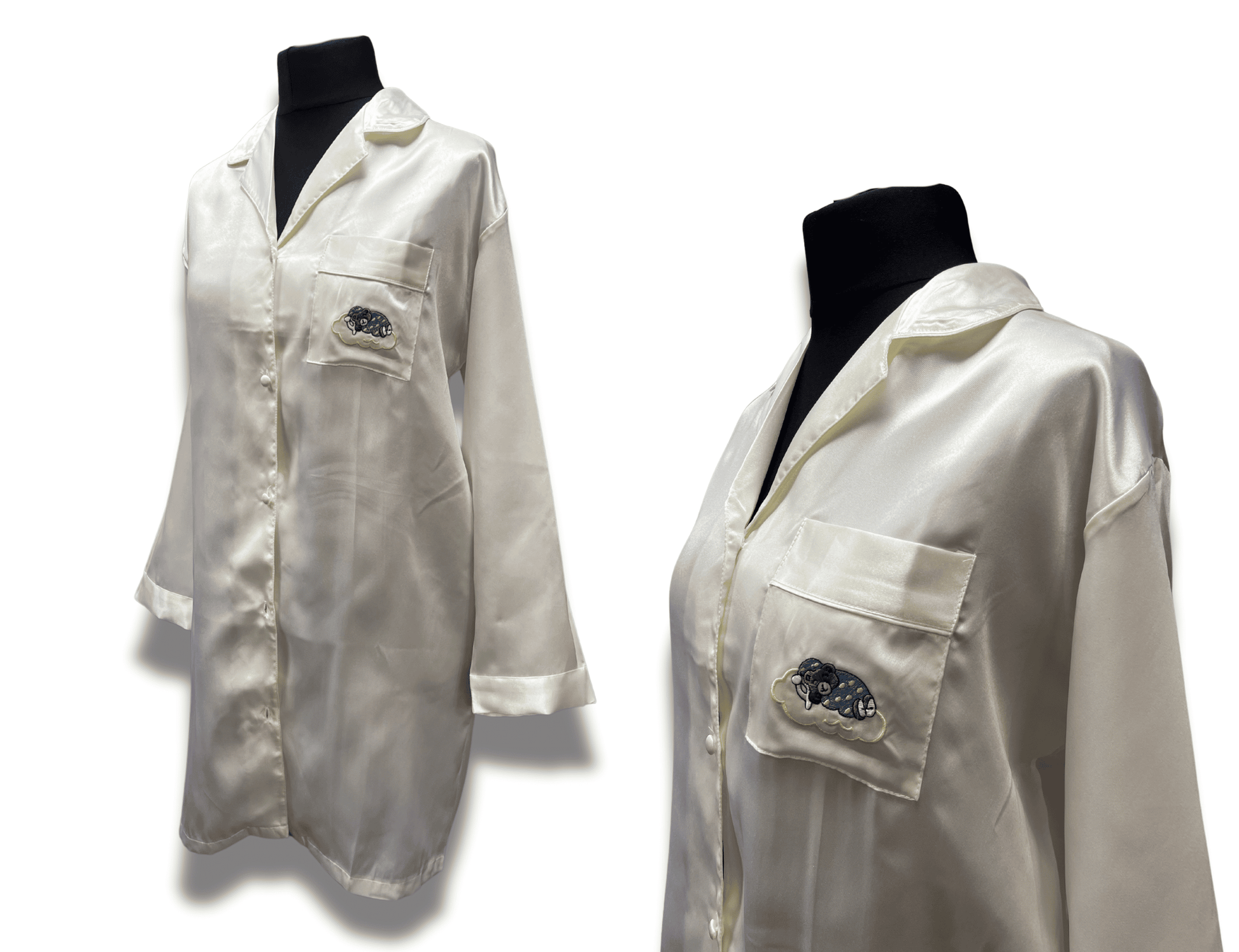 The Sweet Teddy Shirt Dress is perfect for daytime or nighttime wear. This oversized white/ivory dress, vintage 1980s deadstock, features an adorable bear embroidery on the breast pocket and buttons up the front. Look cute and stylish in this sweet-as-pie dress.