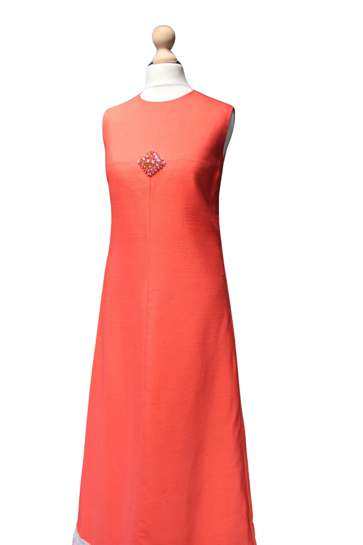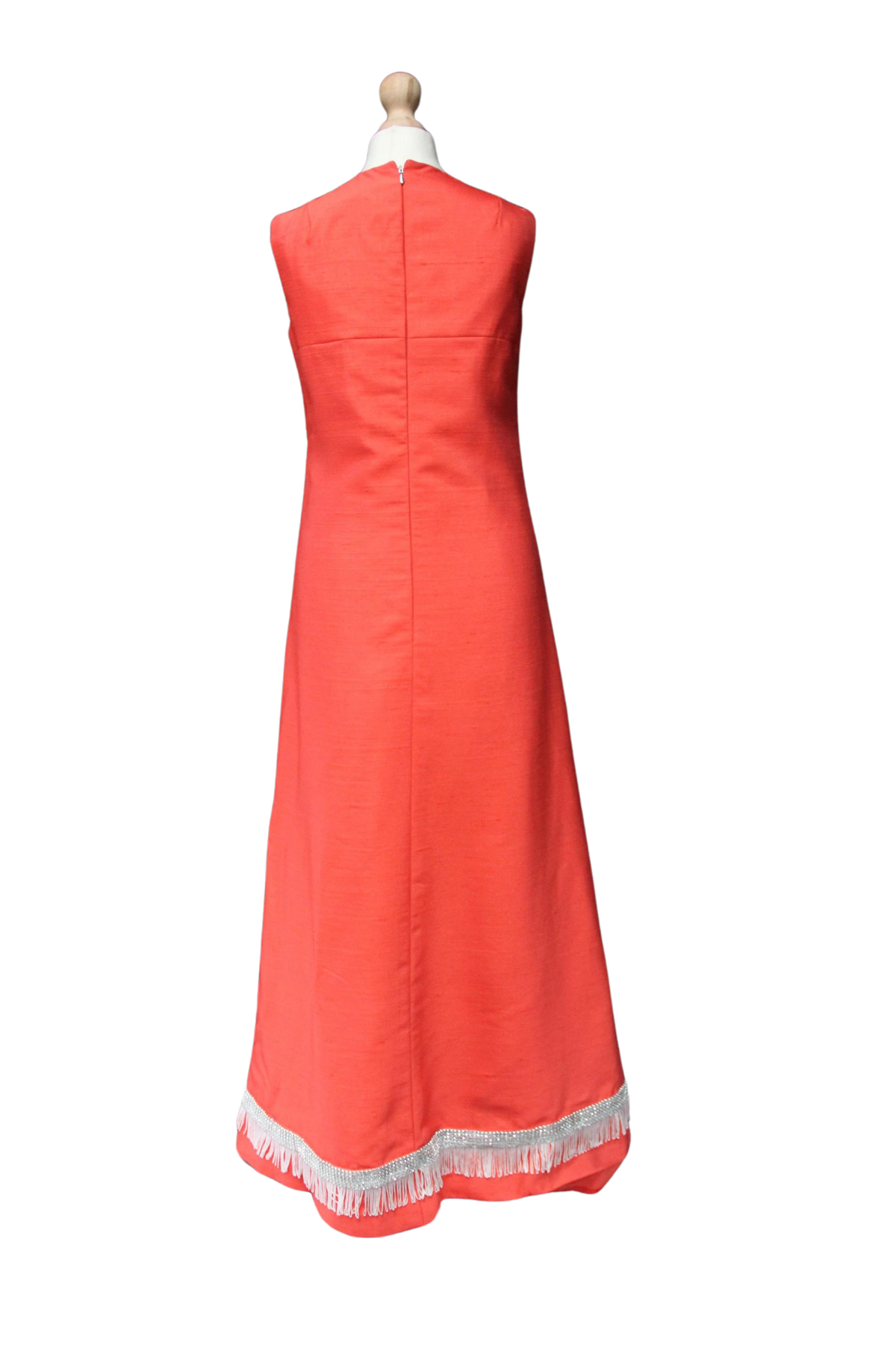 Revamp your wardrobe with this one-of-a-kind Upcycled Fringe & Jewel Embellishment Maxi Dress. The vintage orange evening gown has been given a new life with silver jewel embellishments and a playful fringe detail. This ankle-length dress is perfect for those looking to make a bold statement and add a touch of quirky charm to their style. Featuring a traditional shift dress cut that kicks out at the bottom and a stunning jeweled brooch detail at the bust, this dress is sure to turn heads. Plus, with a fully lined interior and a back metal zip fastening, it's both comfortable and stylish. Don't miss out on this incredibly unique piece from Violet Vintage's "Use Once & Destroy" collection.